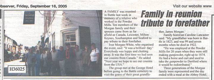 As well as enjoying lunch and lots of chat and laughter, the Morgan cousins paid a visit to James Morgans grave at Battle cemetery and to the Powdermills to see the cottage where he had lived for many years whilst employed as a carman transporting gunpowder.